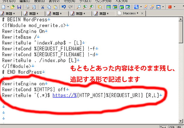 ただし、サーバー上にすでに「.htaccessファイル」が存在する場合は、そのファイルをいったん手元にダウンロードし、そこに追記する形で保存してからサーバに上書き保存してください。